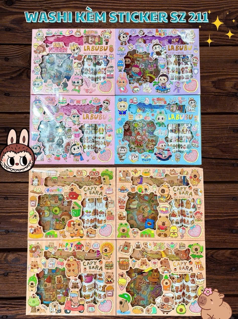 hộp washi kèm sticker và bookmark labubu, capy sz 211